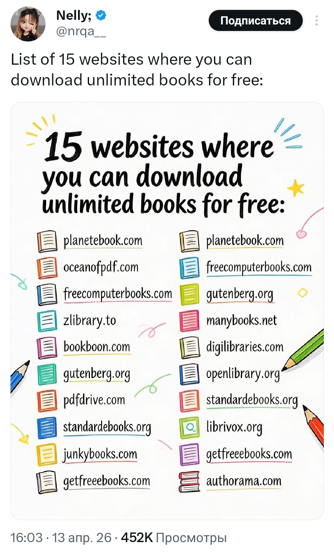 В эпоху цифровых технологий доступ к знаниям и литературе стал проще, чем когда-либо. Однако не у всех есть возможность покупать каждую понравившуюся книгу. Специально для тех, кто ищет способы читать бесплатно, в Твиттере была собрана огромная база из 15 ресурсов, где можно найти художественную, научную и техническую литературу. Эти сайты регулярно пополняются новыми изданиями, что делает их настоящими кладезами для любителей чтения.