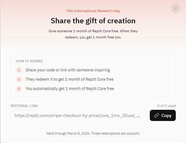 Подписчик нашел акцию на сервис Replit Core — популярный инструмент для разработки приложений и сайтов. Сейчас можно бесплатно получить трехмесячную подписку.