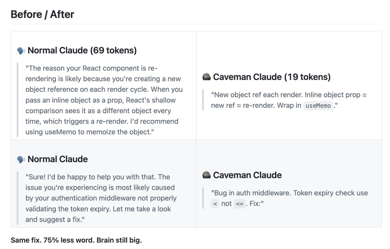Команда разработчиков JuliusBrussee представила инновационный метод оптимизации работы больших языковых моделей, который позволяет существенно сократить расход вычислительных ресурсов. Суть метода заключается в переобучении нейросетей, таких как Claude и Codex, на использование упрощенной лексики, напоминающей речь древних людей. Вместо стандартных фраз вроде «я запустил инструмент веб-поиска», модель теперь использует короткие конструкции типа «инструмент работать» или «я делать». Такой подход позволяет удалять из ответов искусственного интеллекта все лишние слова, оставляя только технически важную информацию.